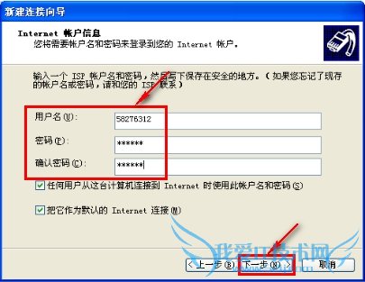 8.“用户名”后面输入宽带帐号,“密码”和“确认密码”后面输入宽带密码--->左键点击“下一步”按钮,如下图: