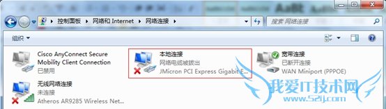 故障点二:已经接上网线,本地连接下方提示网络电缆被拔出。检查网线和网络设备是否正确连接好,如果已经正确连接可能是网络接口的故障,如下图: