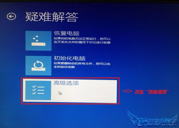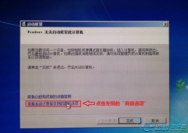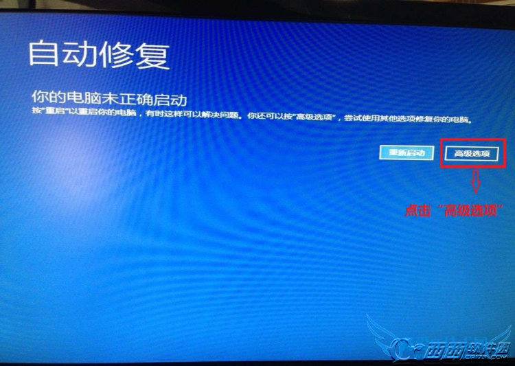在系统自动修复完后显示”你的电脑未正确启动“时,点击“高级选项”