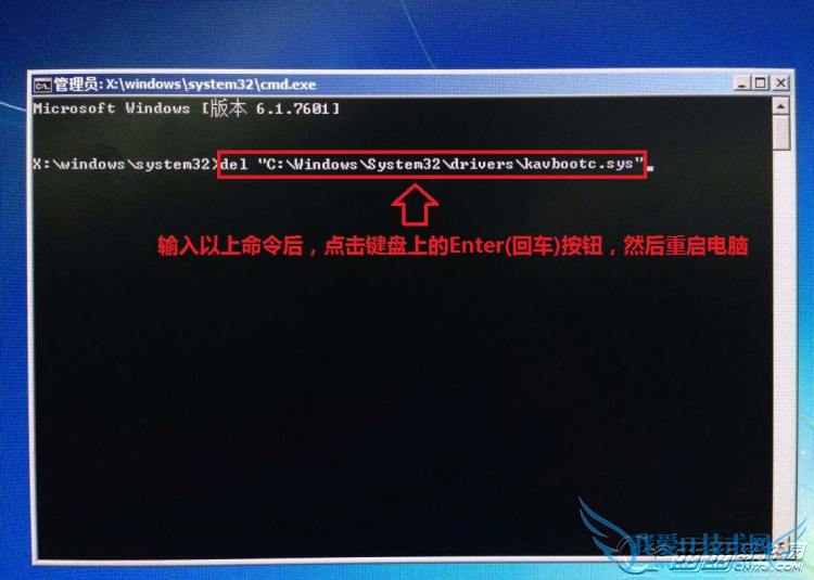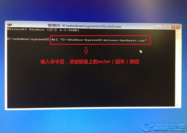 如图,输入 del "C:WindowsSystem32driverskavbootc.sys" 然后点击回车(c: 代表系统盘所在盘符)