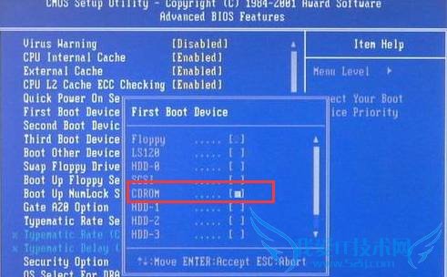 前面的设定才会真正生效。人们需要将第一启动项设定成CDROM,然后再敲击Enter键。
