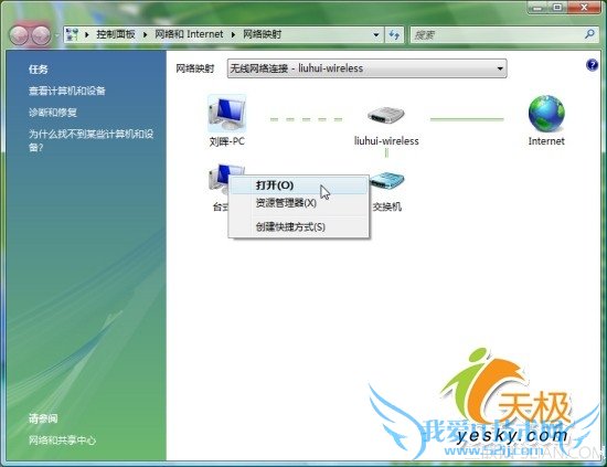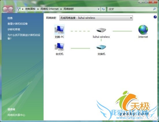 点击图1界面右上角的“查看完整映射”连接,可以打开图2所示的网络映射图窗口。这里显示了位于本地局域网中的所有电脑和网络设备,并可以显示设备之间的连接情况。