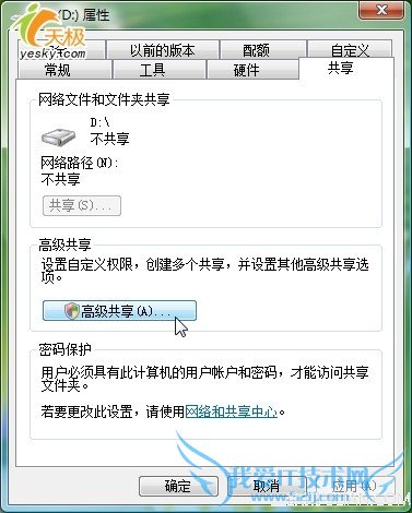 如果我们想要共享自己不具备完全控制权限的文件夹,那么将无法使用简单共享模式,只能使用高级共享。在这样的项目上点击“共享”按钮后,可以看到图10所示的对话框,点击“高级共享”按钮即可开始设置共享。