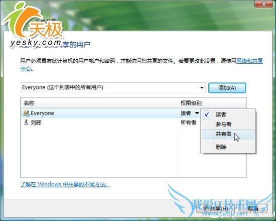 简单共享模式的界面如图8所示。首先在用户列表中选择允许访问该共享的本机用户(或者新建一个用户),接着点击“添加”按钮,将其加入允许列表。随后需要为添加的用户设置权限。在简单共享模式下,有“读者”、“参与者”、“共有者”这三种不同的权限,相比以往的“只读”、“完全控制”等权限,明显Vista中的选项更加简单明了。为每个用户选择好相应的权限后,只要点击“共享”按钮,所有设置就完成了。