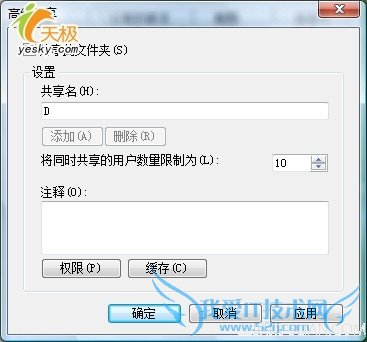 点击高级共享按钮后,可以看到图11所示的高级共享对话框。首先选中“共享此文件夹”选项,然后设置共享名称、连接数量(作为客户端操作系统,Vista取决于版本,最多只能允许10个并发连接)、注释,并添加权限,设置缓存。这一切和老版本的Windows差别不大,因此本文不准备多说。