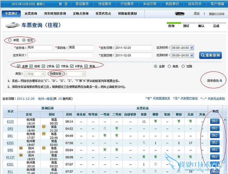 注册好后,赶紧登录、进入车票预定。选择单程、或者往返。出发地:输入城市名首字母即可。如hz就显示出来是“杭州”,nc就显示“南昌”,选择好出发日期、返回日期。点查询。当然,里面还有高级查询,你可以选择各种类型的车次、席别、张数。目前,网站可以办理车次以"C"、"D"、"G"、"Z"、"T"和"K"开头的旅客列车售票业务。简码为车站简拼前两位或三位,简拼超过三位使用前两位加最后一位,例如上海虹桥SHQ。