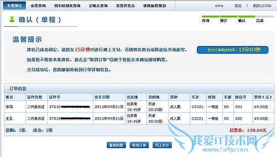 网上订火车票流程第八步——确认订单