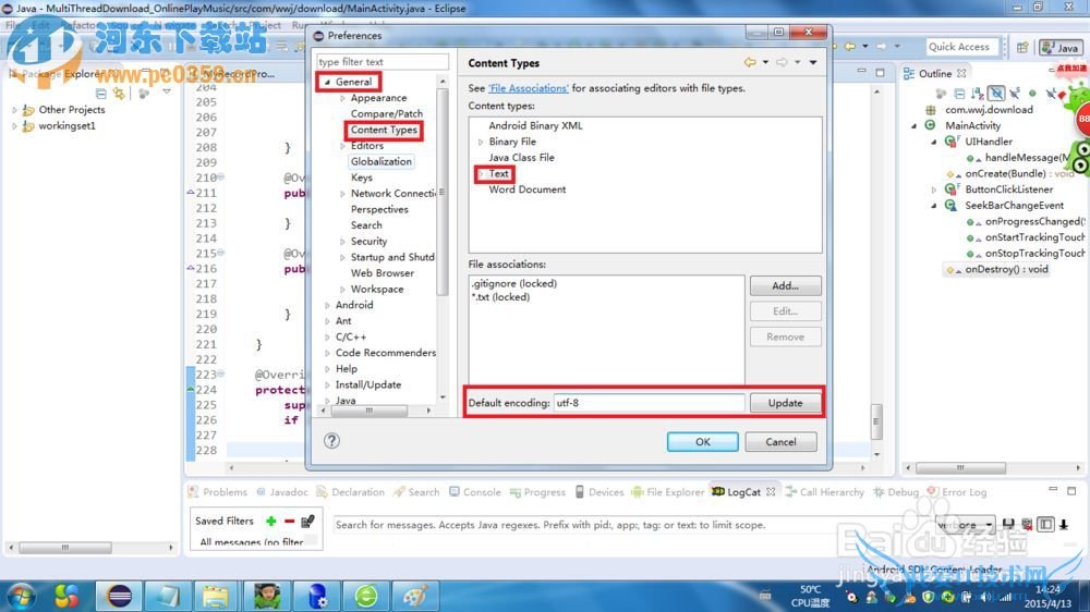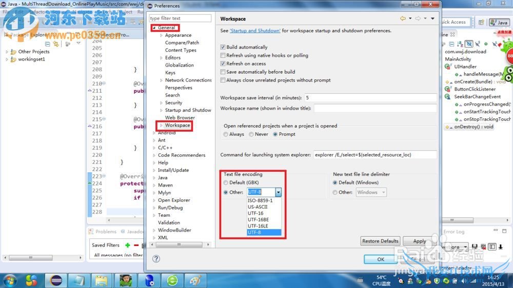 3.General->Workspace菜单右边:Text file encoding 修改为utf-8