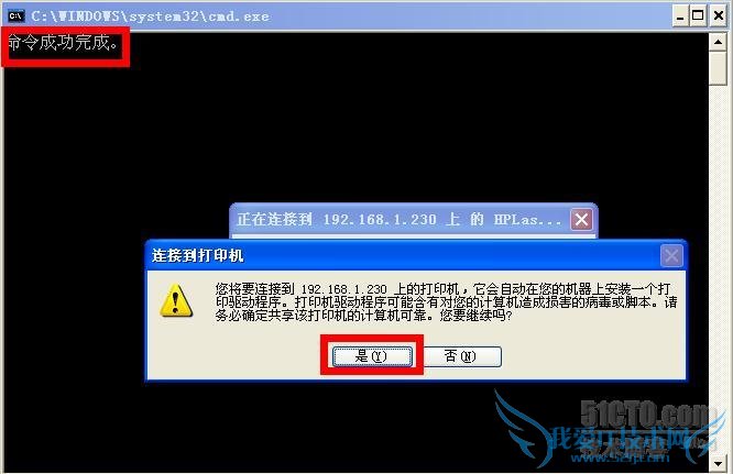 5,点是后,添加打印机就完毕了,命令窗口也自行关闭。可以看到打印机已经连接成功并且设置为默认了。