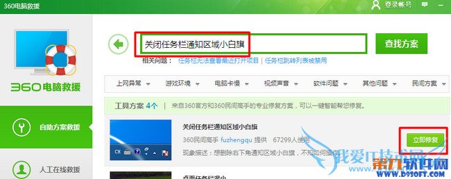2.接着在打开的“360电脑教程”窗口中,输入“关闭任务栏通知区域小白旗”,并进行搜索。并从搜索结果中选择对应的项,点击“立即修复”按钮。