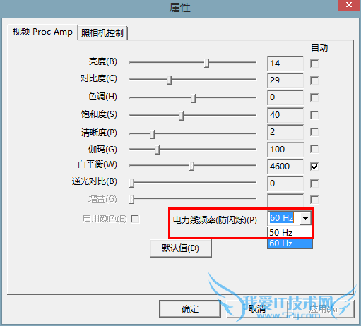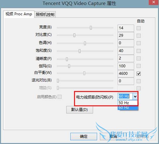 3. 界面和QQ视频设置下的画质调节相同,将“电力线频率(防闪烁)”从60HZ改为50HZ。