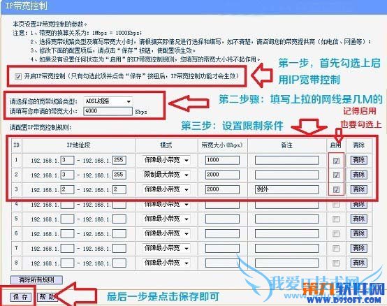 如上图,大家设置路由器限速一定要注意以上四个步骤,首先是要第一步,要勾选上“开启IP宽带控制”,然后是第二步,选择自己家的宽带情况,上面演示的是笔者家拉的4M网络。然后就是下边的设置本地IP地址限制网络情况,上图演示的是笔者打算将自己电脑IP地址设计为192.168.1.2,网络分配情况是最低2M,最高也不超过2M,给予其他用户,192.168.1.3-192.168.1.255用户设置限制最低保障1M,最低不高于2M。