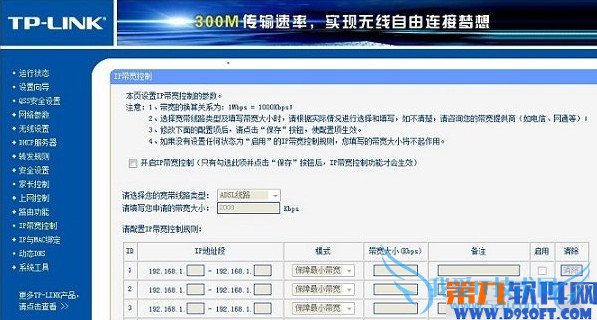 3、如上图,我们点击“IP宽带控制”即可进入路由器限速设了,如下图所示: