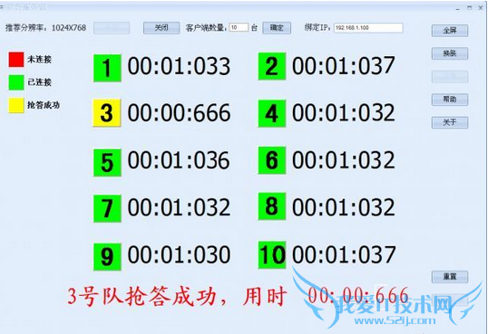 所有客户端参赛队使用的电脑与抢答服务器连接成功后,在“抢答器服务器”程序界面中就会以绿色显示出所有连接成功的客户端名称。所有的客户端都连接成功后,就可以开始抢答竞赛了。