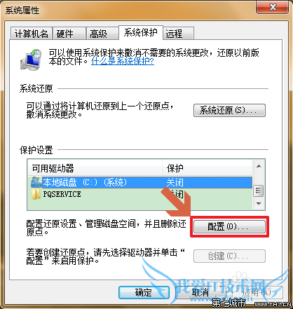 3、在系统属性界面,点击“系统保护”选项卡,选中C盘驱动器,并点击“配置”按钮。