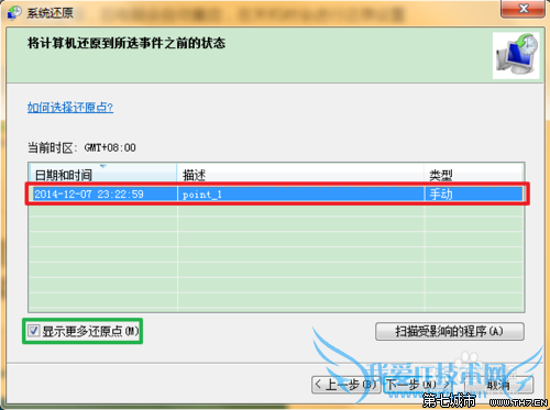 11、选择还原点,如果需要显示更多还原点,则可以勾选“显示更多还原点”,然后点击“下一步”按钮。