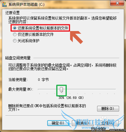 4、在系统保护本地磁盘界面,选中“还原系统设置和以前版本的文件”选项,并拖动下方滑块调节为还原点所提供的空间大小。