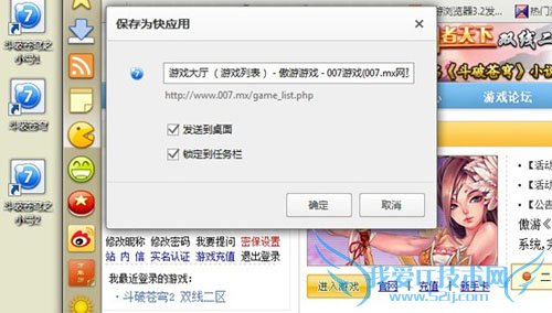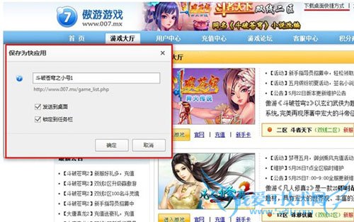 在保存的时候,可以按照自己的需求输入要保存的名称,比如刚才的应用可以命名为“傲游斗破苍穹主号”。默认的保存地址共有两种选择,“发送到桌面”,以及“锁定到任务栏”。注意哦,其中“锁定到任务栏”选项只能在Win7系统下生效。