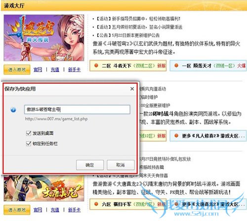 首先,我们用傲游3浏览器打开傲游游戏网址(http://www.007.mx/),选择第一个《斗破苍穹2》进入游戏专区。然后在当前标签上点击右键,在弹出菜单中选择“保存为快应用”项目。在弹出的对话框中完善信息,点击确定即可将当前游戏保存到本地。