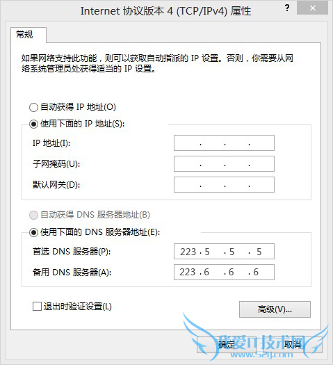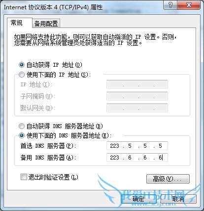 单击“使用下面的DNS服务器地址”, 在首选DNS服务器和备选DNS服务器中输入223.5.5.5 和223.6.6.6。