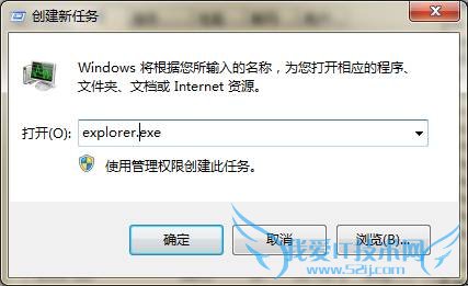 三、接下来在弹出的对话框中输入“explorer.exe”,点击确定,桌面就回来了。如下图所示:
