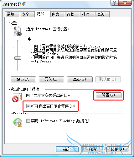 在“Internet选项”窗口中,选择“隐私”标签,勾选“打开弹出窗口阻止程序”就可以啦!
