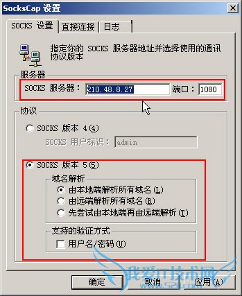 2、在点击设置之后,我们就会看到sockscap设置界面,然后我们在sockscap的设置界面中填入代理服务器的地址,如:210.48.8.27,端口:1080,然后我们选择sockscap5,下面根据自己的情况进行设置,设置完成之后,然后确定即可。如图所示: