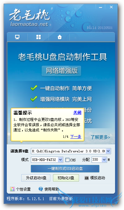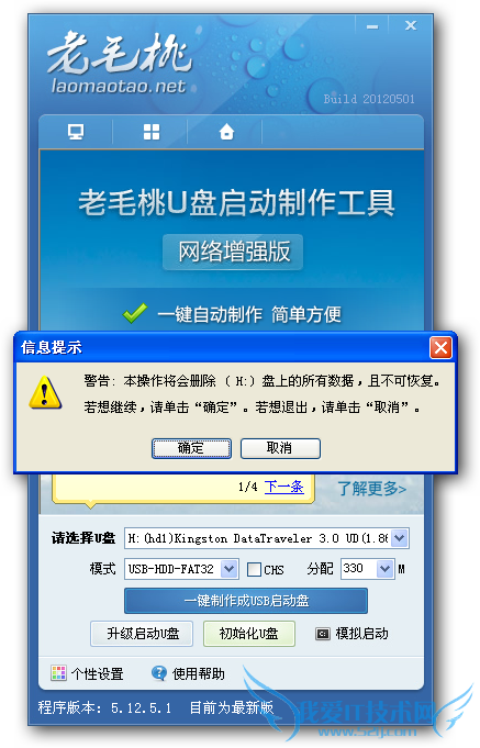 按钮,程序会提示是否继续,确认所选磁盘无重要数据后点是开始制作.