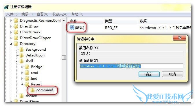 在Reset子键下再新建一个名为Command的子键,设置该子键的键值为 shutdown –r –t 1 –c “1秒后重新启动”
