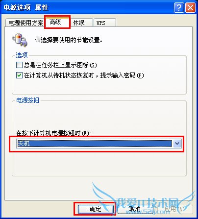 3.接着在窗口中将界面切换至“高级”选项卡,设置按下计算机电源时关机即可;如下图所示: