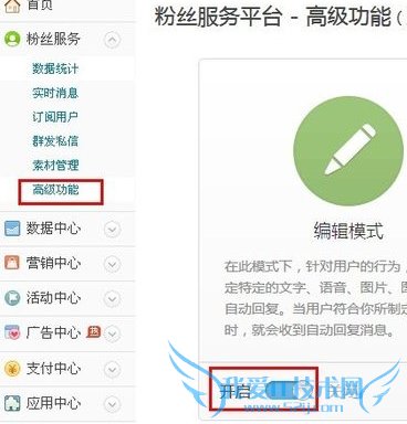 3、然后点击粉丝服务下的高级功能,选择启用右侧的编辑模式。