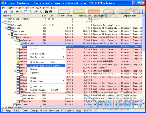 5.用tasklist命令查看的不够详细,你还可以用第三方进展查看软件,或微软内部提供的SysinternalsSuite包中的进procexp.exe进程查看程序来观察判断,对于不确定的进程建议用“Kill Process Tree”杀掉: