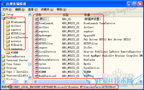 2.知已知彼。Svchost.exe的键值是在“HKEY_LOCAL_MACHINESoftwareMicrosoftWindowsNTCurrentVersionSvchost”,每个键值表示一个独立的Svchost.exe组。所以可以根据这个位置来判断是否中毒: