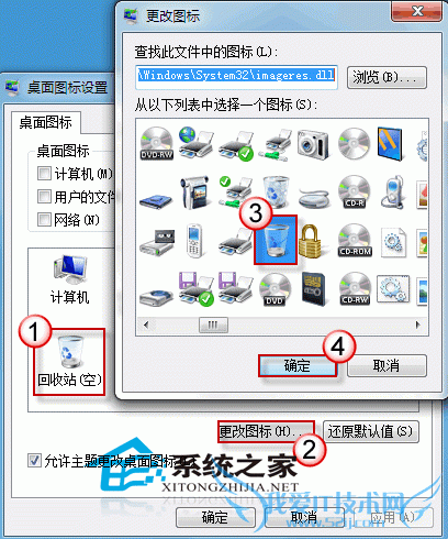 同样地,接下来请选中“回收站(空)”图标,然后单击“更改图标按钮”。在更改图标窗口中选择一个与回收站(空)相对应的图标,按“确定”保存。