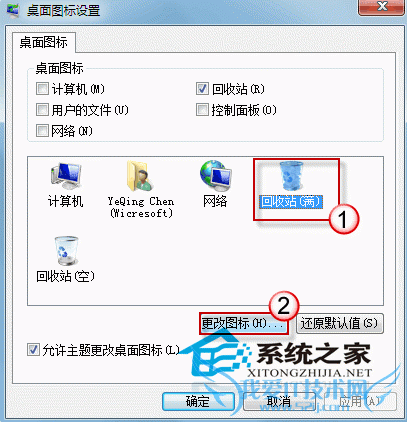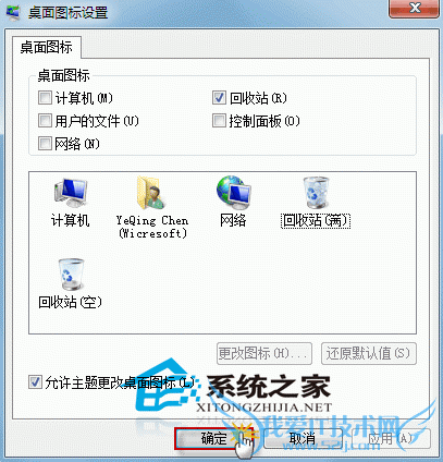 提示:在桌面图标设置窗口会显示回收站(满)和回收站(空)的图标,即使它们都显示正确,请您任对照下面的步骤再进行一次图标对应操作。