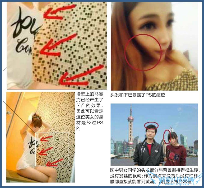 人体PS。时下各大论坛、微博流行“瓜子脸”(很多都是用“液化”工具PS的,这个工具的作用是修改物体的轮廓,例如将人脸往里推就会形成瓜子脸),可我们亚洲人哪有这么多瓜子脸、大眼睛的姑娘呢?很可能她们的照片是被PS过的一一我们可以从头发、下巴和周围的背景来发现破绽。例如,下面右上角图中这位瓜子脸美女,她的下巴太尖了,超出正常人的范围了;右边的头发已经被液化工具扭曲变形,从这位美女的整体发型判断,应该是长长的直发,而不是波浪发。
