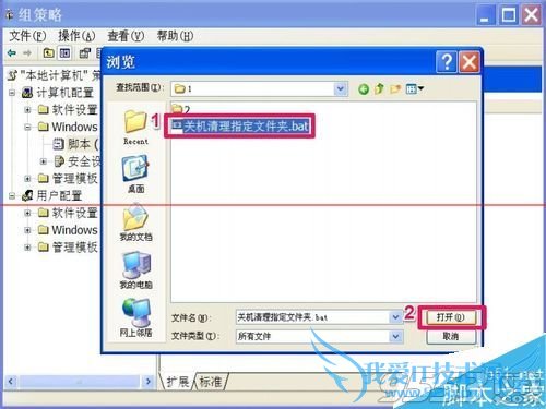 9,找到刚创建的“关机清理指定文件夹.bat”批处理文件,按“打开”,然后一路返回“确定”,“应用”再“确定”。整个过程就设置好了,关机时,就会启动批处理文件清理掉指定的文件夹下的文件了。