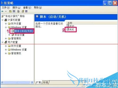 6,然后在“Windows设置”下,选择“脚本(启动/关机)”这一项,来到右侧窗口,选择“关机”。双击。
