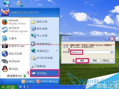4,下面就是如何设置让这个批处理文件在关机时自动运行。在开始菜单中,打开“运行”,然后输入“gpedit.msc”命令,确定。