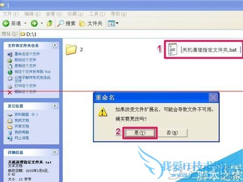 3,保存好后,将这个文本文档的后缀改为.bat格式,即批处理格式,弹出警示框,按“确定”即可,这个清理文件就制作好了。这个批处理文件名可以随便起,如“关机清理指定文件夹”,但后缀名一定要为.bat格式,
