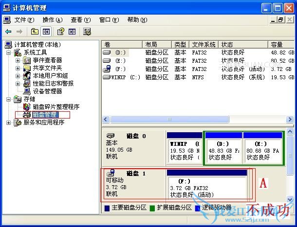 如下面两幅图片所标“A"处,如果成功为两个分区,不成功或者没有制作为一个分区