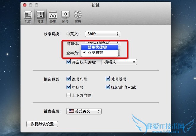 在偏好设置中的“摁键”一项当中有“全半角”切换,一般情况下,搜狗 for mac是金庸快捷键的,你需要如下图所示选择快捷键,快捷键组合同样是“Shift+空格”。好了,小伙伴们赶紧去试试吧!