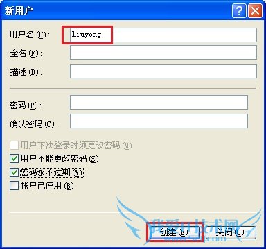 3. 在弹出的新用户建立对话框,输入用户名如:liuyong,其他选项根据实际情况自行勾选或输入。确认无误后点击“创建(E)”按钮,如下图所示: