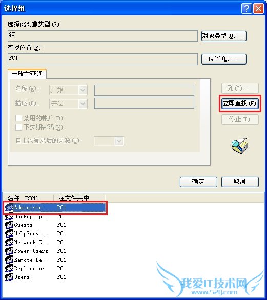 7. 在高级对话框,点击“立即查找(N)”按钮,然后在下侧列表中选择“Administrators”并双击或“确定”。如下图所示: