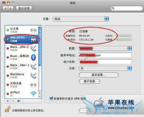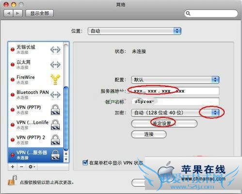 第四步:当建立好一个虚拟连接之后,上图我们可见在左边的网络连接列表的最后一项便是当前建立完成的虚拟连接, 右边 设置虚拟连接的服务器地址和账户名称.密码的设置是在“鉴定设置”里完成的,