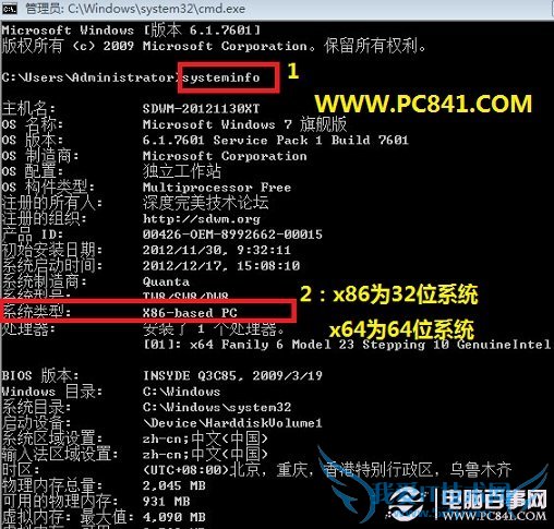 如上图所示,输入systeminfo按回车即可查看系统详细信息,其中找到系统类型一项,如果显示是“x86”则为32位系统,“x64”为则64位系统,如上图,笔者电脑为X86,显然属于32位操作系统了。