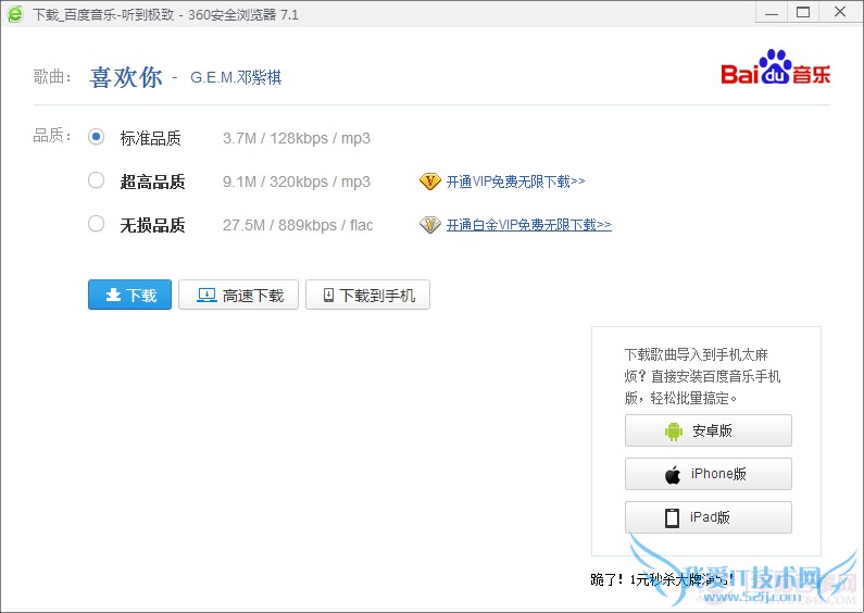 注意要全部复制下载,以.mp3结尾才是完整正确的.例如完整的音乐链接地址应该是这样的:http:/ /www.pc841.com/ files/yinyueshiting.baidu.com/data2/music/122674129/xxxxxx.mp3 (也就是说,是由http开头,.mp3结尾)
