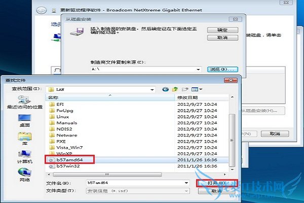 二、 通过驱动信息文件INF手动安装:很多时候我们所下载的驱动文件中并没有可执行的安装程序,只有包含硬件ID信息的INF文件,那么这时就需要用这种方法定位相应的INF驱动文件进行安装,这种方法稍显繁琐,不建议一般的用户操作, 此种方法对于驱动中带SETUP安装程序的驱动包也有效。下面就以安装Broadcom57XX系列有线网卡为例 ,详细介绍下具体的安装方法。