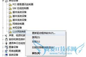1. 点击-计算机-右键-管理-设备管理器(点击-计算机-右键-属性-硬件-设备管理器或者控制面板-系统-硬件-设备管理器也可以),找到以太网控制器,点击右键,在弹出的菜单中选择更新驱动软件,如下图4: