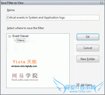 最后,您也可以为创建的日志视图取一个好记的名字,或者,设定哪些用户能够查看,是当前用户还是该计算机上的所有用户。